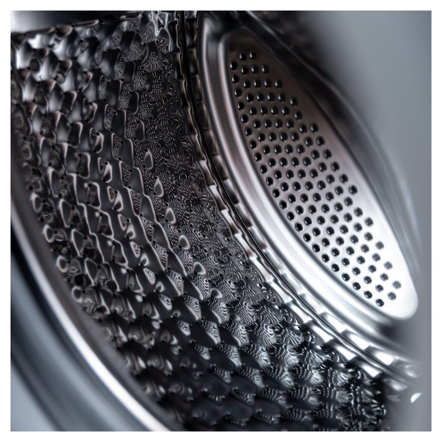 Вместительный барабан позволяет аккуратно распределить вещи, предотвращая их излишнее сжатие и повреждение, а также способствует более качественной стирке даже крупных предметов одежды, таких как одеяла или пледы.